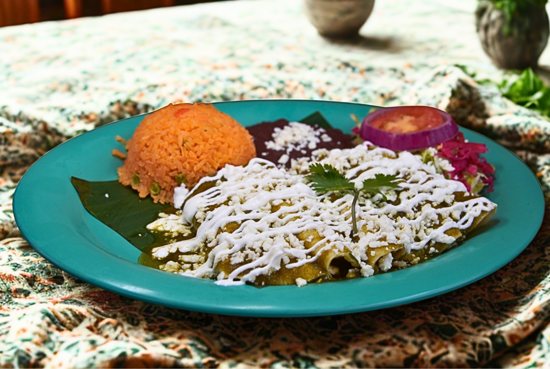 Tres enchiladas rellenas de frijoles negros, queso fresco y crema.