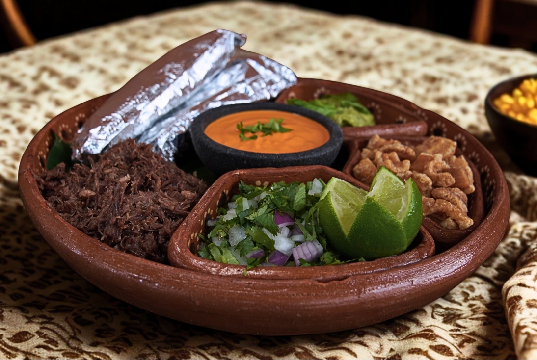 Barbacoa de res cocida a fuego lento, salsa, guacamole, cilantro, cebolla, chicharrón y tortillas de maíz.