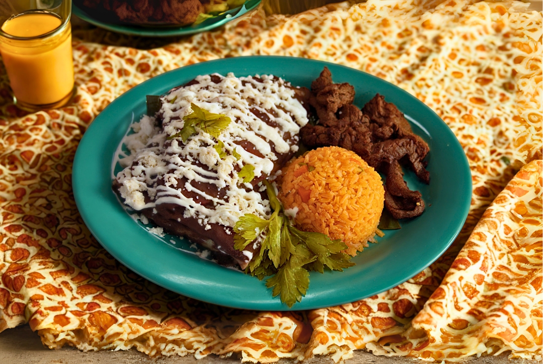 Cinco empanadas fritas rellenas de queso Oaxaca con lechuga, cebolla morada y fajita de res. Servidas con arroz y frijoles.